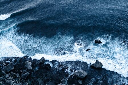 Aerial view of ocean waves breaking on the cliffs of the island of Madeira