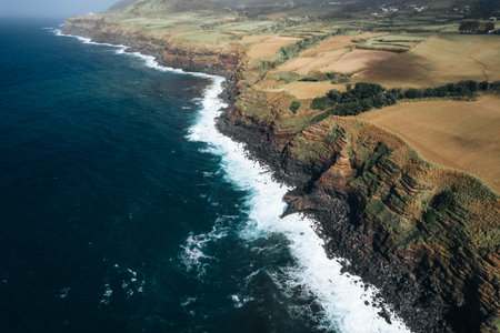 Aerial photo of coastline, land and ocean in Azores Sao Miguel Portugal