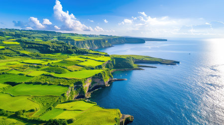 This image showcases a breathtaking coastal landscape with vibrant green hills and steep cliffs caressed by calm waters under a bright sky.