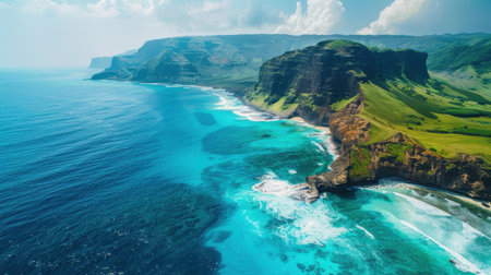 Experience the breathtaking beauty of a tranquil coastal landscape with lush green cliffs and pristine turquoise waters, perfect for nature enthusiasts.