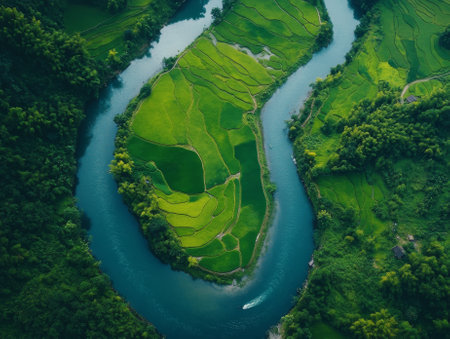 Discover the stunning aerial view of vibrant green rice terraces alongside a serene blue river, showcasing the beauty of rural landscapes and agriculture.