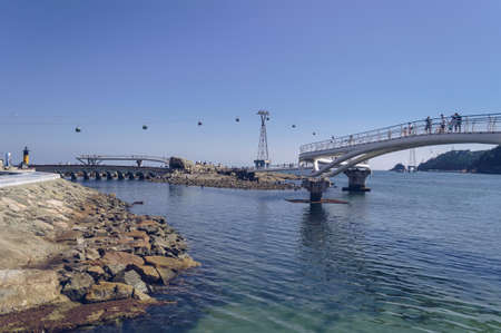 Busan, South Korea, September 14, 2019: view from below on moving Songdo cable cars and overwater walking bridge