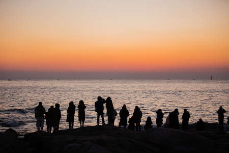 BUSAN, SOUTH KOREA - OCTOBER 13 2019: crowd of tourist at Haedong Yonggungsa Temple view of the temple on cliff over the seashore on October 13, 2019 in Busan, South Korea