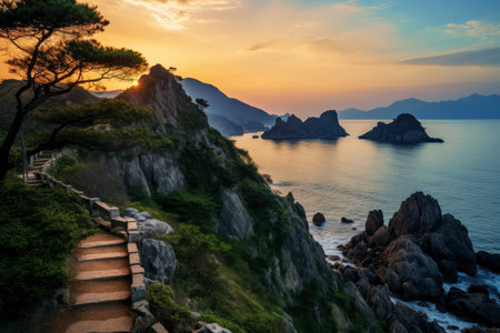 Coastal Pathway at Sunrise with Seaside Cliffs and Pine Tree