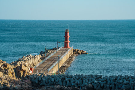 Close view of the red lighthouse on a tetrapod-lined breakwater at Naksan Beach, South Korea, as gentle waves lap the harbor entrance.
