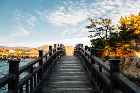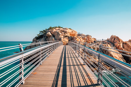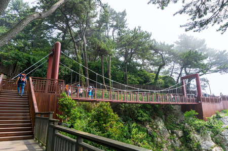 BUSAN,SOUTH KOREA - JULY 20, 2017: The wooden suspension bridge on the rock cilff in Haeundae Dongbaekseom Island near Haehundae beach.