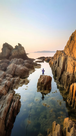 Generative AI : Abrasion platform flysch and cliffs in Costa Quebrada Cantabria Spain Beautiful seascape at dusk by the Cantabrian Coast
