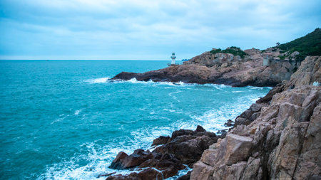 Landscape of blue sea, mountains and textured rocks. Hazy dreamy sky. Longdong is a paradise for viewing sea views in the north of Taiwan.