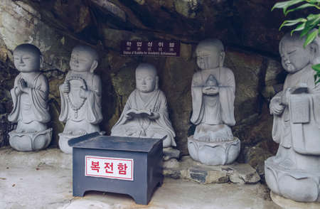 Busan, South Korea, September 12, 2019: Buddha statues to pray for academic achievements in Haedong Yonggung Temple