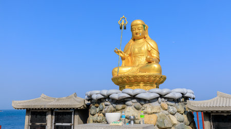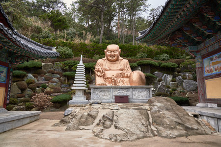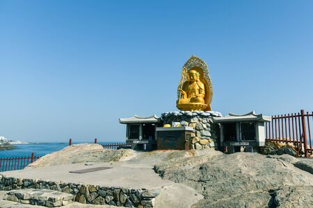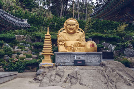 Busan, South Korea, September 12, 2019: smiling golden Buddha of Haedong Yonggung Temple