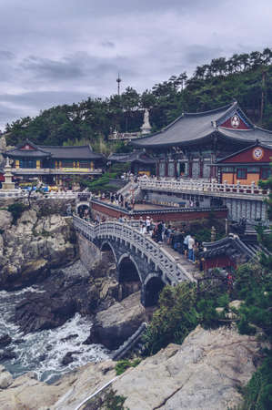 Busan, South Korea, September 12, 2019: people visiting Haedong Yonggung Temple on gloomy day