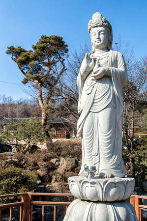 Buddha statue and korean traditional house behind in Naksansa temple, South Korea