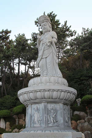 The crowning Gwanseeum-bosal statue in cloudy day at seaside of Haedong Yonggungsa Temple, Busan, South Korea