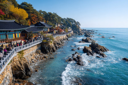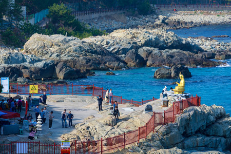 BUSAN, SOUTH KOREA - OCTOBER 13 2019: crowd of tourist at Haedong Yonggungsa Temple view of the temple on cliff over the seashore on October 13, 2019 in Busan, South Korea