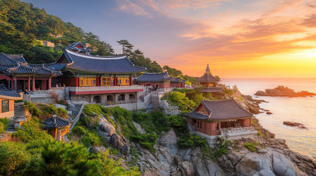 A breathtaking view of a coastal temple at sunset, featuring traditional architecture against a stunning ocean backdrop. Perfect for travel and nature themes.