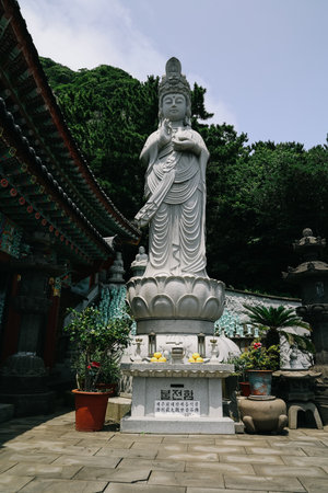 Jeju Island, South Korea - July 12, 2022: Sanbangsa or Bomunsa Temple located at the foot of the Sanbangsan mountain where a Buddha statue is enshrined.