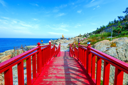 Haeundae sea and wooden bridge at Haedong yonggungsa temple in Busan,South Korea.