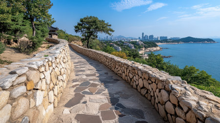 An architectural structure stands along a rocky coastline, with vibrant autumn foliage adding color to the scene. The image displays a long, winding pathway and a body of water under a bright sky. The composition showcases a peaceful environment that can be used for travel, editorial, and design projects.
