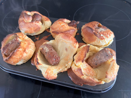 yorkshire pudding with vegan sausage Toad in the Hole recipe with vegetarian pudding for individual home made tasty snack in baking tray
