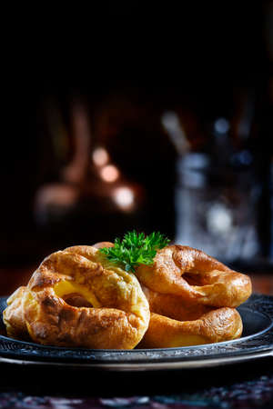 Classic English Yorkshire Puddings stacked together with garnish against a rustic background. Copy space. The perfect image for your restaurant menu cover design.