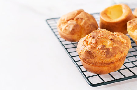 Popovers on a black pastry rack on a white background, copy space. Eggs and butter flavor, tasty snack, easy cooking breakfast. Yorkshire pudding