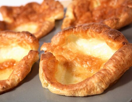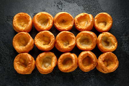 Traditional English Yorkshire pudding freshly baked on a tray ready to be served with a Sunday roast dinner lunch, stock photo image