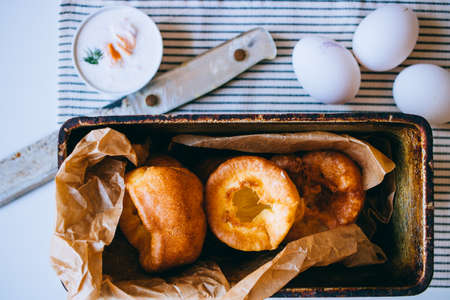 Homemade popover, which is a lush, airy and egg hollow roll in the oven. Yorkshire pudding freshly baked in baking dishes, selective focus