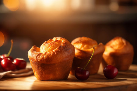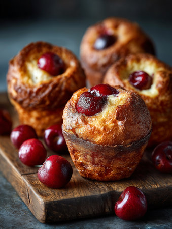 Freshly baked cherry muffins sit on a wooden board, garnished with ripe cherries, conveying a sense of warmth and indulgence.
