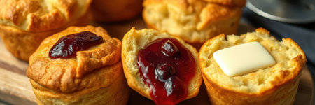 Freshly baked muffins topped with jelly and butter on wooden serving board