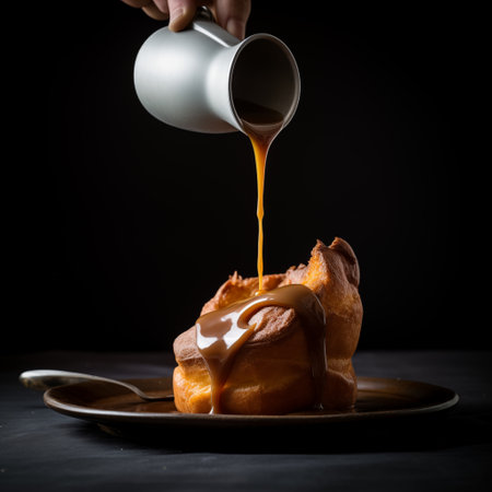 Close-up of a perfectly golden Yorkshire pudding as rich gravy is poured over it, emphasizing the crystalline detail and dramatic lighting. AI-generated