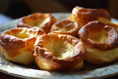 A plate of golden Yorkshire puddings with a light, fluffy interior and crisp edges, ready to complement a hearty British roast meal, traditional English dish, banner