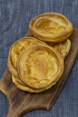 Yorkshire pudding, homemade, stacked on a wooden chopping board with a blue tea towel underneath