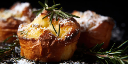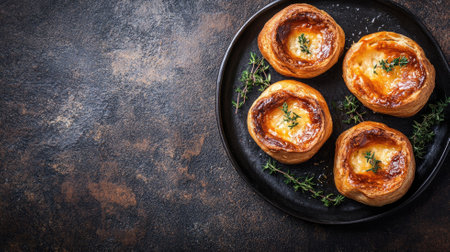 Baked pastries with golden crusts and fresh thyme on plate