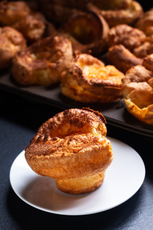Traditional English Yorkshire pudding side dish on black rustic background