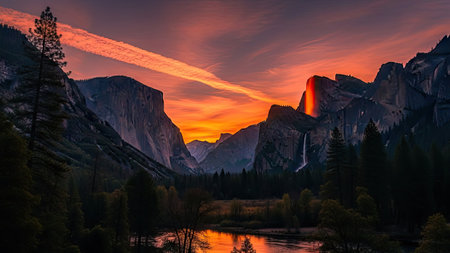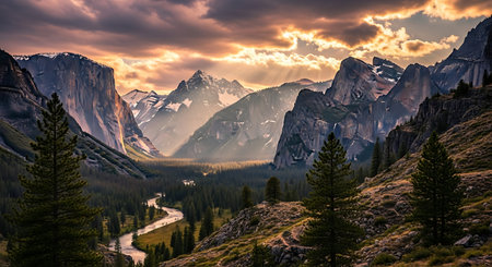Bathed in the golden hues of twilight, a captivating panorama unfolds at the heart of Yosemite Valley The tranquil riverside mirrors the radiant sunset like a celestial canvas, its glassy surface shimmering with vibrant reflections Majestic rocky cliffs, etched with time, rise majestically from the valley floor, their imposing profiles casting long shadows that dance across the landscape Lush forests add a symphony of emerald greens, their foliage whispering secrets in the fading light Witness this breathtaking symphony of nature where the beauty of Yosemite Valley reaches its zenith AI Generative