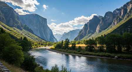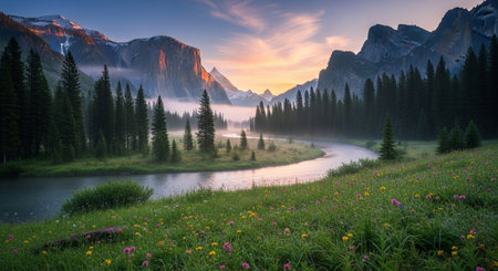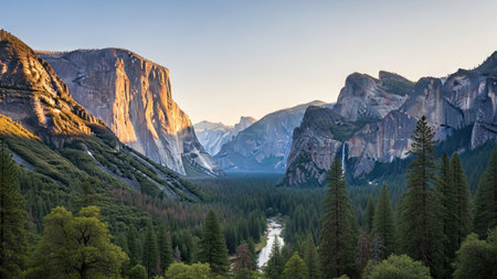 A serene mountain landscape with a river flowing through a valley surrounded by trees and cliffs at sunrise