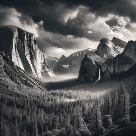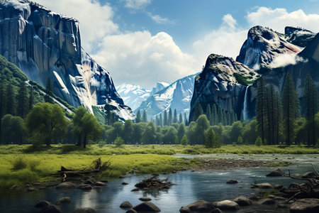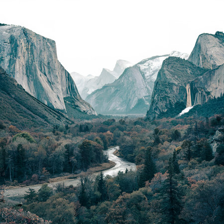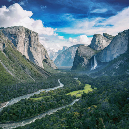 Experience the breathtaking beauty of Yosemite Valley, where stunning waterfalls cascade amid towering mountains under a brilliant sky, inviting exploration and tranquility.