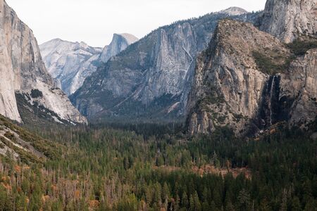 The views from Tunnel View Point in Yosemite National Park with El Capitan, Cathedral Rocks and the Half Dome in the background, California, USA