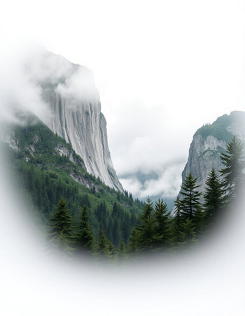 Yosemite Valleys dramatic cliffs dominate, bathed in sunset hues. A river winds through a dark green forest. The sky is a vibrant purple and pink. The scene evokes serenity and awe. No transparency in the background. A timeless natural landscape.