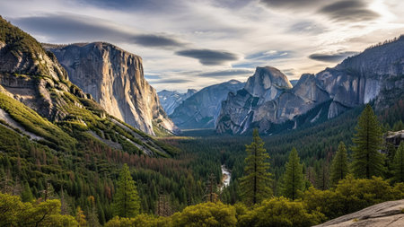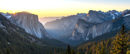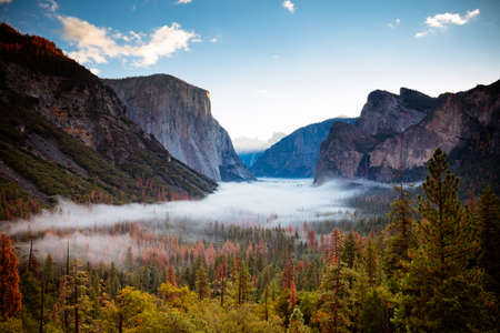 Yosemite valley nation park during sunrise view from tunnel view on morning time. Yosemite nation park, California, USA. Panoramic image.