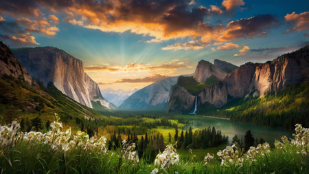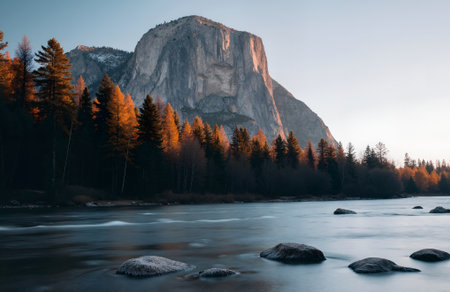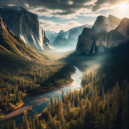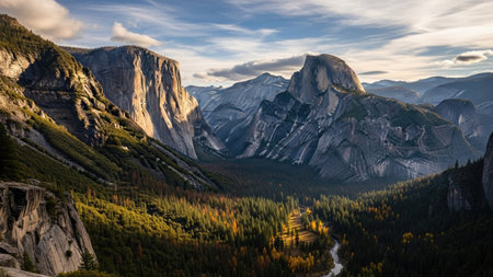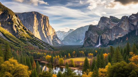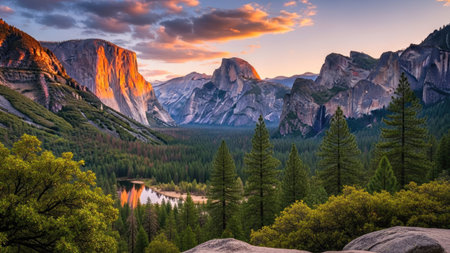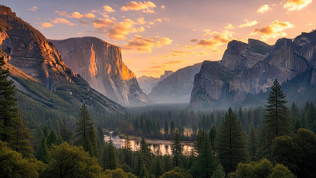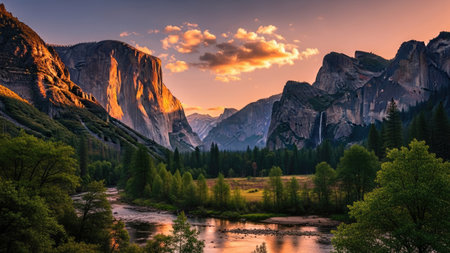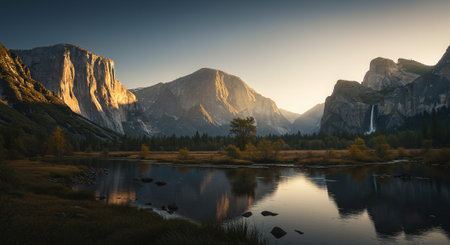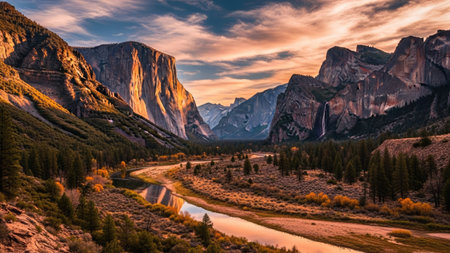 A sweeping vista of Yosemite Valley at sunset, featuring towering granite cliffs illuminated by golden light, a lush forest with vibrant autumn foliage, and a calm...