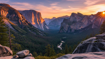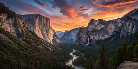 Yosemite Valley at sunset. Towering granite cliffs frame a winding river flowing through a verdant forest. The sky is a vibrant mix of orange and purple. The scene evokes a feeling of awe and tranquility. No transparency in the image. Solid background.