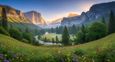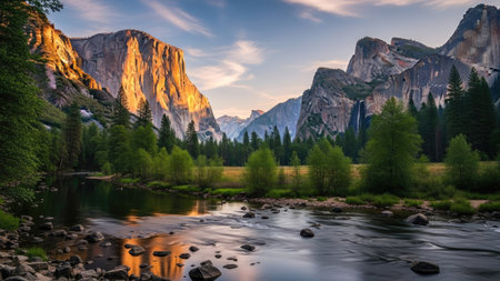 The iconic Yosemite Valley bathed in the warm golden light of sunrise, with towering granite cliffs and a winding river flowing through the lush green valley.