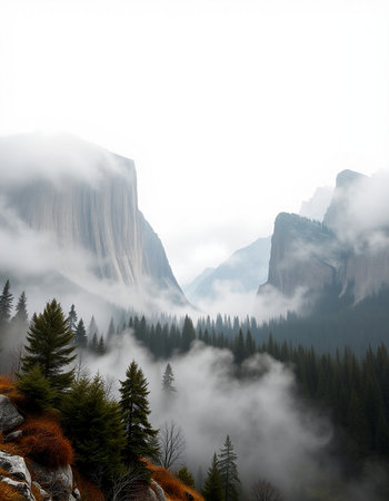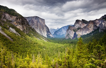 tunnel viewpoint at yosemite national park with heavy overcast and bright green fir forest