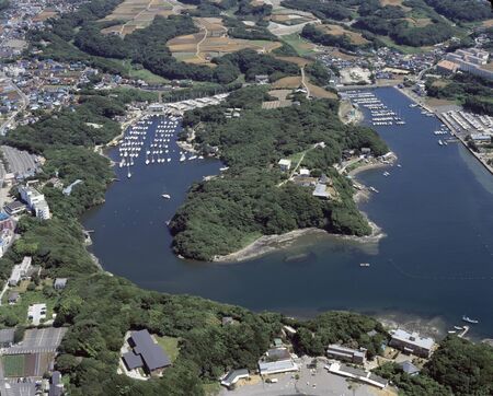 Aerial view of a coastal shrine in Japan