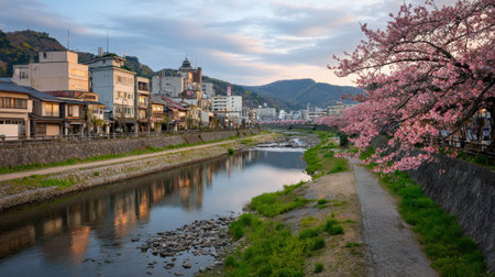 Pink sakura trees line a river as mountains rise in the distance under a colorful sky at sunrise. The scene captures the beauty of nature.