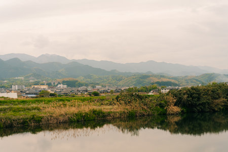 shikoku, japan - 3 August 2025 An ide to a rice field in the Japanese city of Kazo with the reflection of houses on the water.