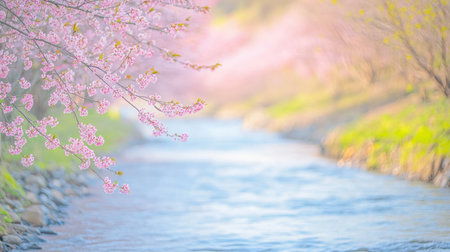 A peaceful view of cherry blossoms hanging over a gentle river, surrounded by pastel colors that evoke tranquility and the beauty of nature in springtime.