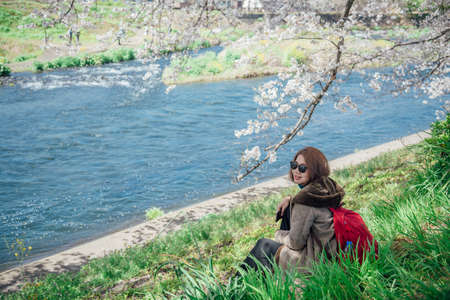 A woman traveler looking at the beautiful scenery of sakura cherry blossom at the Uruigawa river in Japan.