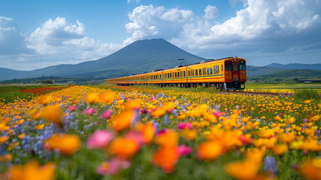 Train on a meadow with flowers and mountains in the background.